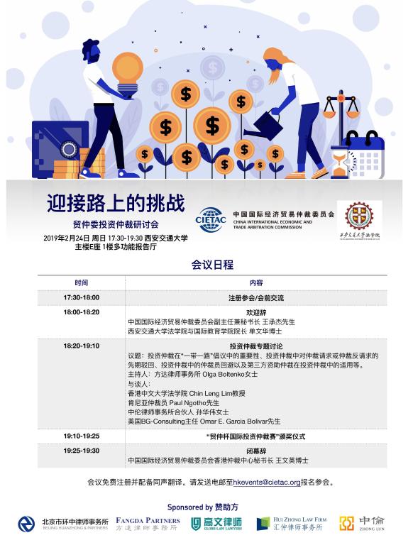 贸仲委投资仲裁研讨会暨“贸仲杯国际投资仲裁赛”颁奖仪式将于2019年2月24日下午5:30-8:00在西安交通大学主楼E座多功能报告厅举办,诚邀各位师生参加!