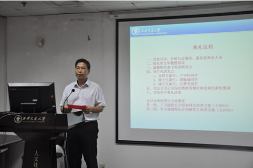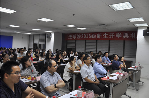 9月18日晚,法学院2016级新生开学典礼在主E703隆重举行。院长单文华教授,党总支书记王保民教授,副院长李万强教授,副院长丁卫副教授,院长助理吉兰湘老师和苏金远教授,院工会主席张弘副教授,文治书院院务副主任郭小平老师,院办主任张美萍老师,法学复合51班班主任薛华、唐学亮老师,法学61班班主任王玉苹、卞苏老师以及全体2016级本科、硕士、博士生新生参加了开学典礼,会议由学院学生工作专职委员张乃钟老师主持。