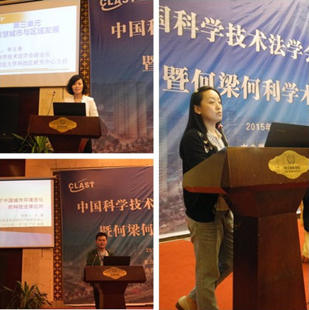首先,法学院知识产权研究中心周方副教授、李晓鸣讲师、张磊博士作为法学院科技法学研究团队的代表,向2015年中国科学技术法学会年会进行主题汇报,报告的题目依次为《一带一路战略实施中的知识产权信息国际半岛(中国)机制研究》、《完善我国外籍人士科学技术奖励制度的对策研究》、《治理学视野下城市环境恶化的科技法律应对》。三人的主题报告在大会上产生良好效果,形成了大会积极围绕讨论的主题内容,受到与会同行专家学者的一致好评。