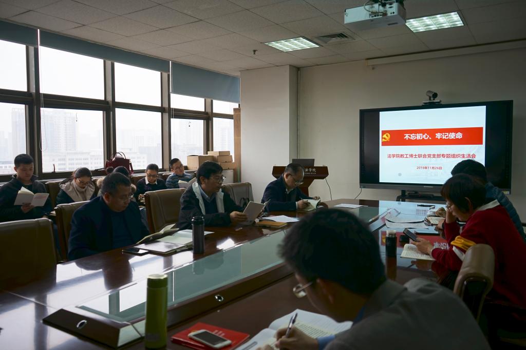 2019年11月26日下午,法学院教工博士联合党支部在主E-910开展“不忘初心、牢记使命”专题组织生活会,会议由支部书记曹毅搏主持。