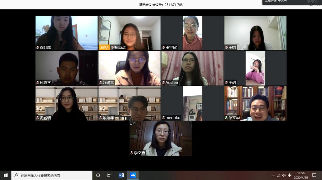 4月28日晚,法学院硕2018级党支部组织开展线上组织生活会,会议的主题以习近平总书记考察西安交通大学,并鼓励交大师生努力发扬西迁精神,争做时代新传人为背景,支部特别邀请了法学院副院长丁卫老师与同学们一起交流学习,会议由支部书记谢雨蓉主持。