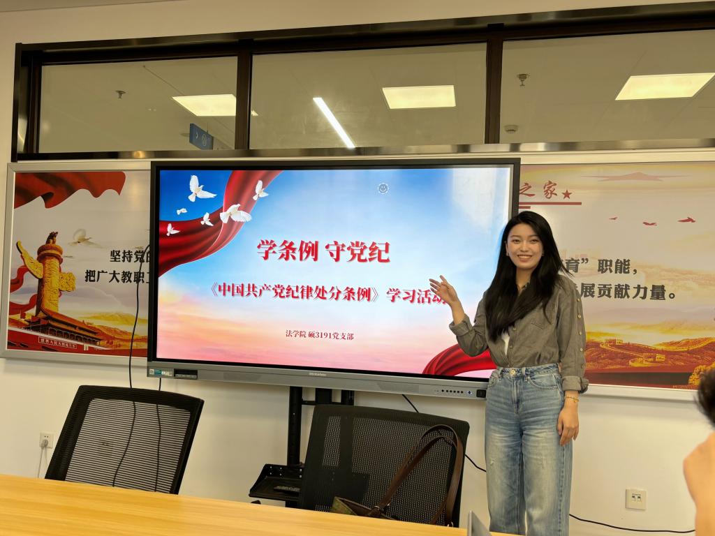 为深入学习贯彻习近平总书记关于党纪学习教育的重要讲话和重要指示精神,引导广大党员干部学纪、知纪、明纪、守纪,自觉用党规党纪校正思想和行动,帮助支部内党员同志深入学习理解、贯彻执行好《条例》,2024年4月25日下午,法学院硕3191党支部全体党员于涵英楼5-3001开展了题为“学条例·守党纪”的《中国共产党纪律处分条例》学习活动。