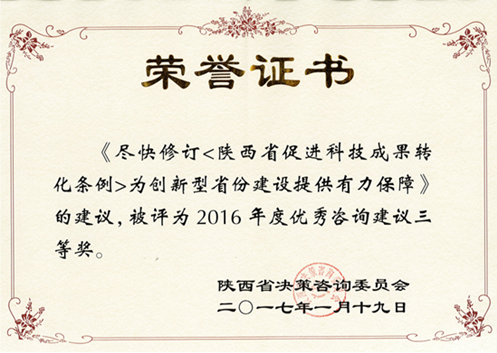 《建议尽快修订< 陕西省促进科技成果转化条例>为创新型省份建设提供有力保障》的建议刊发在《决策咨询建设》2016 年第11期上。娄勤俭书记在建议报告上做了多处标记,对建议的观点表示了赞同。娄勤俭书记、张道宏副省长先后做出批示,要求省科技厅、省法制办、省人大等有关单位深入研究落实。马治国教授在该建议中指出,推进陕西省创新型省份建设,促进陕西“科教大省”向“科教强省”的转变及与“一带一路”沿线国家开展国际科技半岛(中国)和交流,开展陕西省军民科技资源开放共享并加快军民两用科技转化和产业化,都需要尽快修订《陕西省促进科技成果转化条例》进而提供有力保障。目前该条例已经列入了省人大常委会的立法计划。
