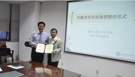 日前,现任欧华律师事务所中国区管理合伙人刘巍律师受聘我校客座教授仪式在法学院举行。校长王树国亲自颁发聘书,聘任刘巍律师为我校法学院客座教授。法学院院长单文华教授、院长助理苏金远教授出席聘任仪式。王树国校长在受聘仪式上表示,国际法在当今国际社会发挥着十分重要的作用。国际法是交大法学院的优势学科,希望刘巍律师作为交大法学院的一员,能够为法学院的发展贡献一份力量。刘巍律师也表示,对交大有着深厚的感情,愿意为法学院的建设给予力所能及的帮助。