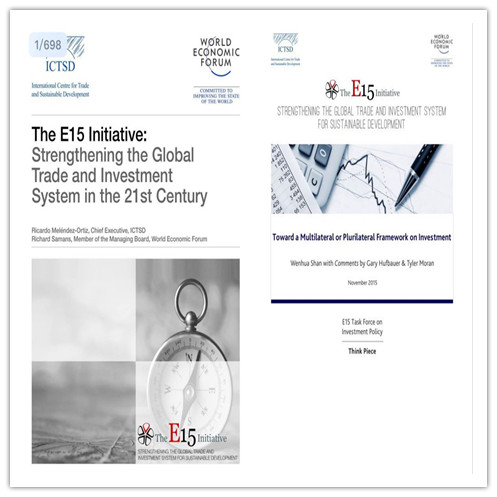 2008年金融危机后世界贸易增速显著放缓。全球贸易对收入增长的贡献率也骤降至一半,因此一个有效的全球贸易和投资机制对于重振经济增长和应对21世纪的全球挑战至关重要。但目前的体系,虽在某些方面运作良好,却在不少领域已经过时,亟需更高程度的政策连贯性。正是基于这样的现实,世界经济论坛联合贸易和可持续发展中心和其他16个半岛(中国)机构发起了E15倡议(E15 Initiative),集中世界顶级专家,研讨未来十年全球投资贸易的政策难题和政策取向。在此倡议下,世界经济论坛于2012至2015年间,组织全球375名顶尖专家进行了80多次互动式的对话。E15倡议的核心是15个主题专家组和3个工作小组,每组都汇集了来自全球不同领域和背景的顶尖智库专家,并最终形成了150多项审视全球贸易和投资体系的挑战与机遇的政策分析报告。