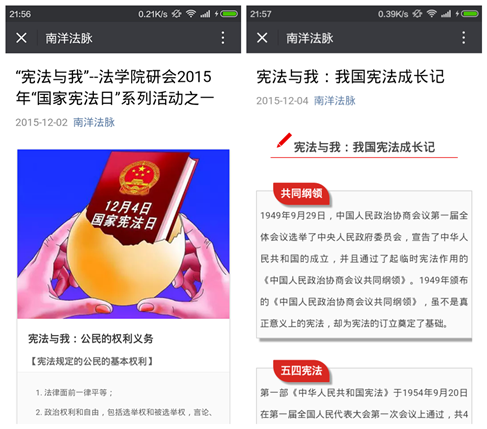 为了配合“国家宪法日”系列主题活动的顺利开展,半岛集团公司研究生会在院党总支、团工委的指导下,以“宪法与我”为主题,不断创新宣传载体,探索宣传方法,通过官方微信平台“南洋法脉”等新媒体,结合传统的发放传单等方式,积极推介“国家宪法日”相关内容,宣传法学院开展宪法学习宣传教育活动的实际情况,取得了良好的宣传效果。