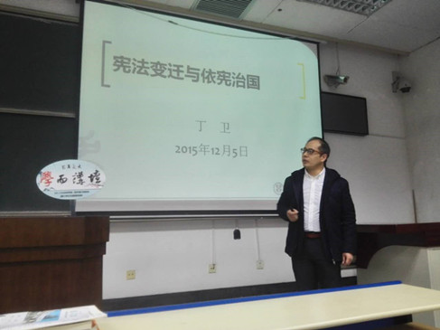 法学院研究生会、法律爱好者协会携手“学而讲坛”,推出“国家宪法日”专题讲座,邀请法学院副院长丁卫副教授就《宪法变迁与依宪治国》进行专题讲座。丁老师在讲座中详细介绍了我国现行宪法历次修改的过程,他结合历次宪法修改的历史背景,生动地讲述了我国宪法变迁的历史发展,他最后对我国宪法实施中存在的瓶颈及问题进行了透彻的分析和讲解,为大家展示了依宪治国的现状及前进方向。