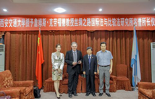 作为当今世界最著名和最有影响力的国际法学者之一,James Crawford教授于2013年入选西安交大法学院讲座教授。2014年,他被包括中国在内的27个国家提名为联合国国际法院大法官候选人。他的来访吸引了国内新闻媒体的密切关注,新华社、中国社会科学网、中国日报、陕西日报、陕西省外事办和新浪网都进行了报道。