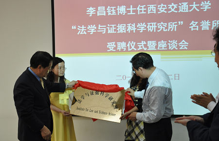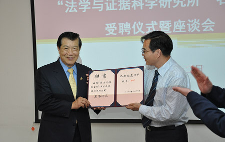 10时整,李博士的受聘我校“法学与证据科学研究所”(ILES,“法证据所”)名誉所长仪式在主楼E910会议室隆重举行。仪式由法学院院长单文华教授主持。徐宗本副校长、国际处梁莉处长、法学院党委书记彭沪生、ILES所长李生斌教授和马治国教授以及法学院王保民副院长出席了仪式。在热烈的掌声中,徐宗本副校长代表学校向李昌钰博士颁发了聘书,并同李博士一起为我校“法学与证据科学研究所”揭牌。李昌钰博士将一条美国康州警政厅的警官领带赠与徐宗本副校长,他还向在场的其它几位学院领导赠送了礼物。徐副校长发表了热情洋溢的讲话,他首先对李博士的访问表示感谢,并对李博士的受聘表示祝贺,希望李博士能把他的真知灼见,经验智慧传授给我校广大师生。他指出,“事是靠人做出来的”,希望在李博士的指导和支持下,法学院和医学院法医学科充分发挥各自优势,把“法学与证据科学”这个新兴的交叉学科做好做强。李博士也发表了热情洋溢的讲话。他首先以DNA立法为例,充分肯定了法学与法医学开展学科半岛(中国),成立法学与证据科学研究所的重要意义。他指出当代科学研究的发展已经把两个学科紧密地联系在一起,法学和法医携手开展证据科学等交叉学科研究,是两个学科保持前沿性,培植学科新增长点的重要举措。他表示,“能够担任贵所所长是我的荣幸”。他说,“很多地方想以我的名字命名成立研究所等,但我都拒绝了。我想,以人的名字命名很容易,但一个人要想真正做点事却很难。就像生小孩一样,要培养他,让他健康成长,所以,我以后会尽力为大家做好服务,也欢迎大家到美国,到我的学校来。”随后,李教授与法学院师生进行一场以“法学与证据科学”为主题的座谈会。座谈会上,李博士幽默风趣,侃侃而谈。老师和同学们踊跃发言,与李博士的讨论热烈而有趣。最后,单文华院长作了总结发言。老师和同学们意犹未尽,都觉得学到了很多书本上没有的知识。