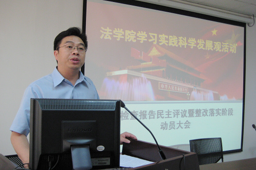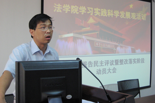7月15日下午,法学院深入学习实践科学发展观活动分析检查报告民主评议暨整改落实阶段动员大会在主E703会议室召开。学院全体教师、民主党派教师代表、学院学生代表参加了会议。会议由学院党总支副书记、副院长、学习实践活动领导小组副组长王保民主持。