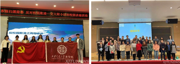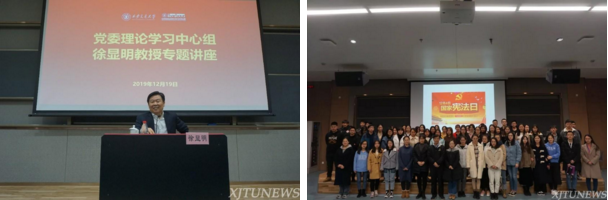 法学院积极组织各项校园文化建设活动,弘扬法治精神。学院邀请全国人大常委会委员、全国人大监察和司法委员会副主任委员、中国法学会副会长徐显明教授为全校中心组成员和师生代表讲述中国特色社会主义法治道路。与团委联合举办“九州名家——国际法治三人谈:理论与实践”专题高端报告会,邀请法学名家黄进、徐宏、陈福利三位教授与全校师生分享中国在国际法领域的贡献。在“3.15消费者权益日”“12.4国家宪法日”精心办好法治宣传品牌活动,提升校园师生的法治意识。在2019年12月4日第六个国家宪法日,法学院举办了首场创新港宪法宣传活动,弘扬宪法精神,树立宪法权威。法学院研会举办了“创新港第一届法律知识竞赛”,在生动有趣的活动中普及法律知识,提升同学们学法用法的积极性。2019年4月法学院硕士生赴交大附小围绕“反对校园欺凌”开展法治宣讲活动,以视频、情景表演、信件沟通等方式进行,形象生动地向小学生们展示了面对校园欺凌,该如何保护自己,如何拿起法律武器保护自己的权益,活动取得了良好的反响。