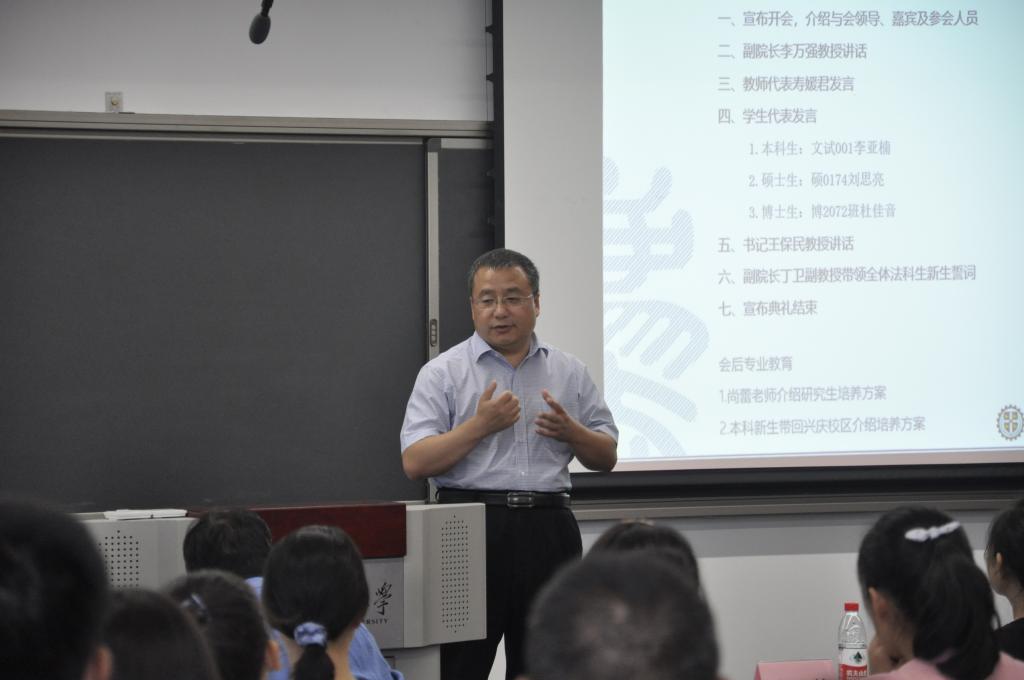 法学院副院长李万强教授首先发表讲话,代表学院欢迎2020级全体新生的到来,介绍了学院的基本情况和发展历程,强调新生同学要在创新港新校区时刻注意个人安全,要充分发扬集体主义精神,积极参加学院各项活动。