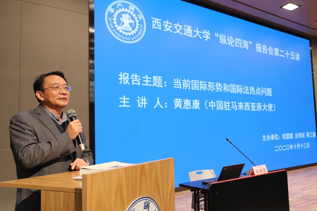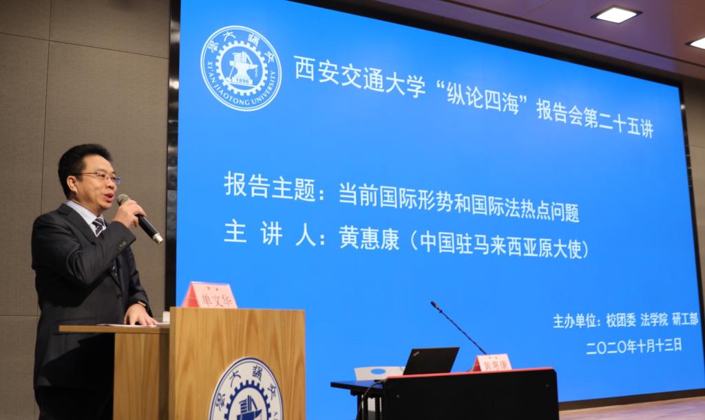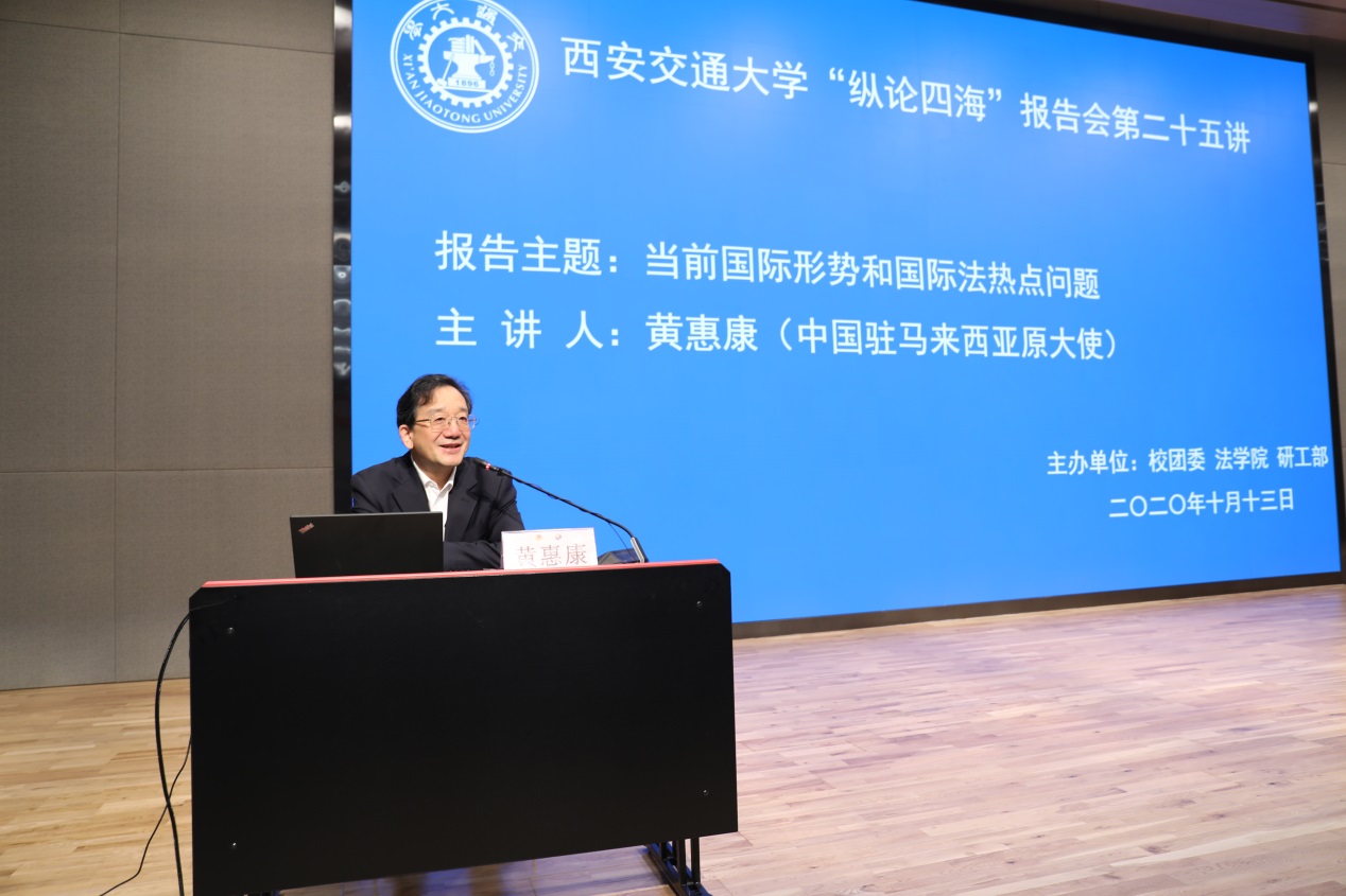 上午9:30分,黄惠康大使主讲的 “当前国际形势与国际法热点问题”专题报告会在新港报告厅举行。本次报告会是西安交通大学“纵论四海”系列高端报告会的第二十五讲,同时是学校党委理论学习中心组和全体校管干部的一次集中辅导报告会,亦是我校法学研究院特别是丝绸之路国际法与比较法研究所和丝绸之路经济带法律政策协同创新中心的“科创月”系列活动之一。西安交通大学副校长席光教授出席报告会并致辞,报告会由法学院院长兼国际教育学院院长单文华教授主持。全校百余名学校正处级领导干部以及其他四百余名师生现场参会。同时,全校其他副处级以上校管干部则在线参加了报告会。