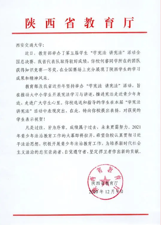 鉴于西安交通大学对此次活动的积极配合,以及法学院老师的倾情指导,陕西省教育厅近日专门发来感谢信,对西安交通大学在此次“学宪法、讲宪法”活动中的选送和指导工作予以表扬和祝贺!西安交通大学获得竞赛优秀组织单位称号,半岛集团公司王保民教授获得优秀指导教师称号。
