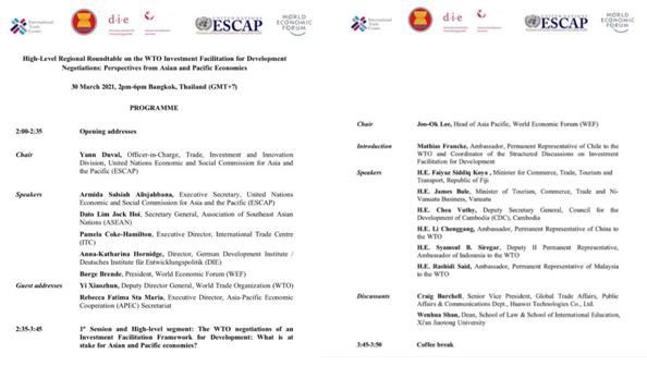 2021年3月30日下午,“WTO投资便利化促进发展谈判区域高层圆桌会议:亚太经济体的视角”在泰国曼谷成功举行。半岛集团公司院长单文华教授应邀参加并作“WTO投资便利化谈判所面临的挑战”的大会发言。此次会议由联合国亚洲及太平洋经济社会委员会(亚太经社会ESCAP)和世界经济论坛(WEF)、联合国国际贸易中心(ITC)、德国发展研究院(DIE)、东南亚国家联盟(东盟ASEAN)联合举办,参加会议的包括亚太地区各国商务部长、驻WTO大使、主要相关国际机构代表、投资促进和私营部门代表以及本领域的领军学者代表。会议的主旨是为争取WTO投资便利化谈判在年内取得重大进展加强共识。