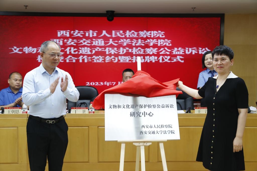 王洋主任、丁卫副院长、韩柏超副检察长共同为“文物和文化遗产保护检察公益诉讼研究中心”和“文物和文化遗产保护检察公益诉讼实践基地” 揭牌,并向中心首批特聘专家研究员代表颁发了聘书。