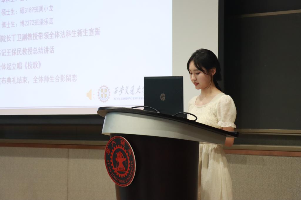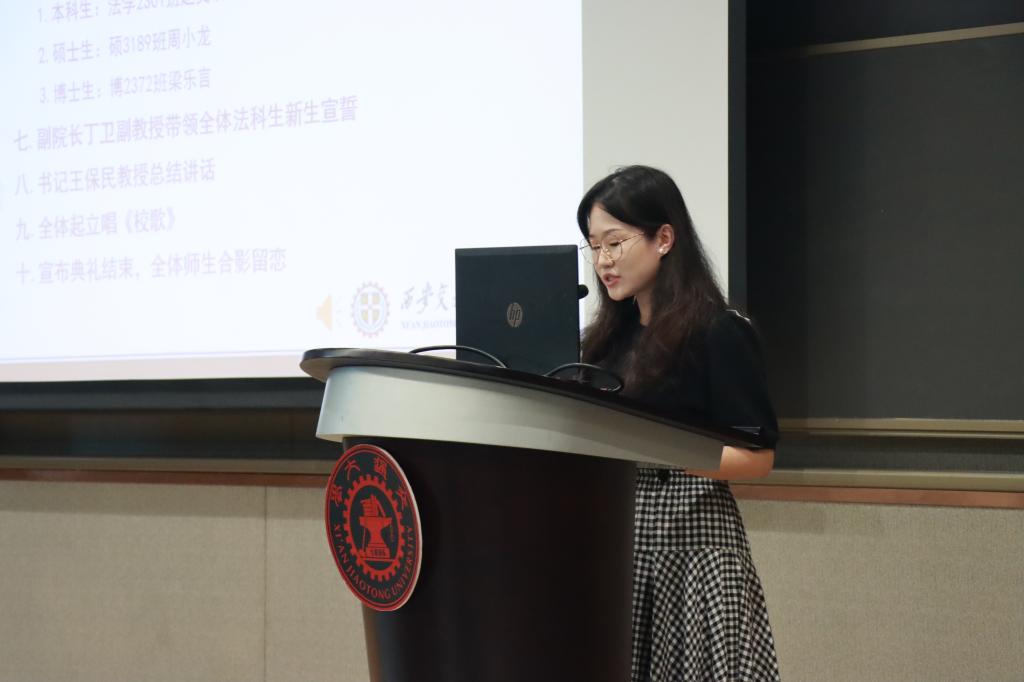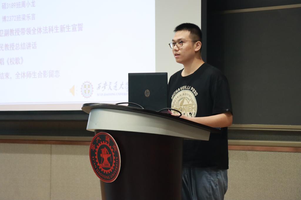 在学生代表发言环节,本科生新生代表赵文琪表达了进入交大法学院的激动之情,言语之间流露着初学者的法治信仰和家国情怀。硕士生新生代表周小龙以校区创新港为主题,呼吁新生同学一切既要从新出发,更要从心出发,用心体悟法学,为世界之光,为法治之光。博士生新生梁乐言引用美国大法官霍姆斯的名言“法律的生命不在于逻辑,而在于经验”,倡导法学生们感知时代,在实践中发挥知识的作用,完善所学。