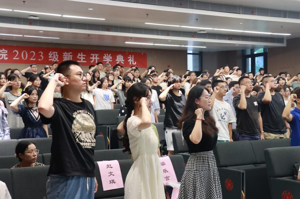 接着,丁卫副院长带领全体法科生新生庄严宣誓:“公平所系,正义相托。在这庄严时刻,我郑重宣誓:我自愿投身法治事业,忠实履行一个法律人应尽的全部义务,恪守宪法,热爱祖国,忠于人民,弘扬法治精神,维护正当权益,勤勉诚信,清正廉洁。我决心竭尽全力,捍卫法律职业的圣洁与荣誉,养天地正气,行人间正道,求正义,尚卓越,为法治中国的繁荣发展和人类正义的美好未来奋斗终身!”
