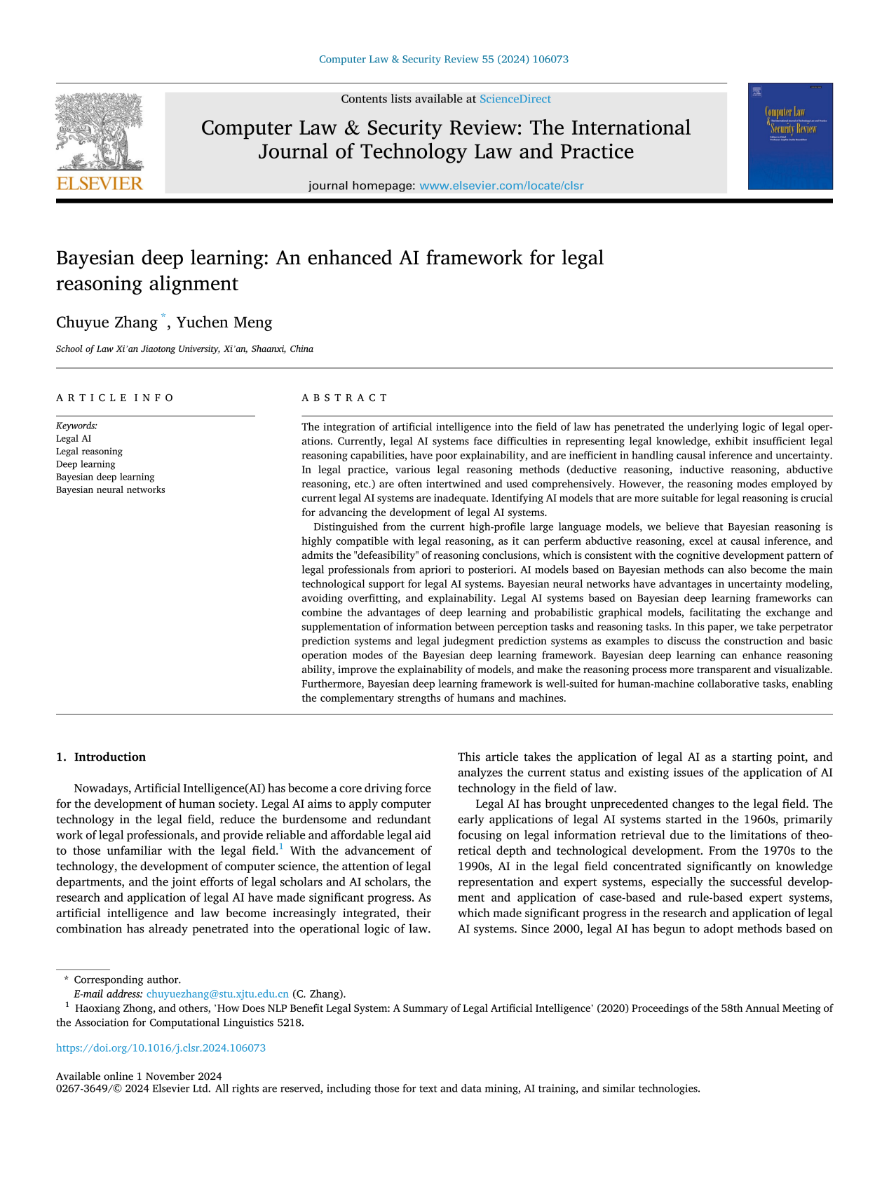 近日,西安交通大学人工智能与信息安全法律研究中心刘东亮教授指导的博士研究生张楚悦、孟宇辰在SSCI一区期刊《计算机法律与安全评论》(Computer Law & Security Review , Volume 55, November 2024)上发表论文《贝叶斯深度学习:与法律推理相协调的增强型人工智能框架》(Bayesian Deep Learning: An Enhanced AI Framework for Legal Reasoning Alignment)。