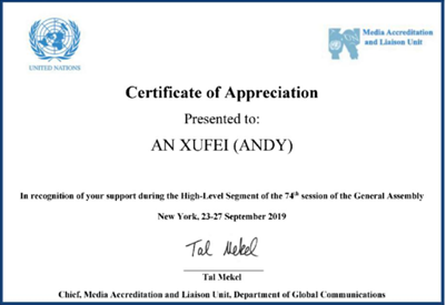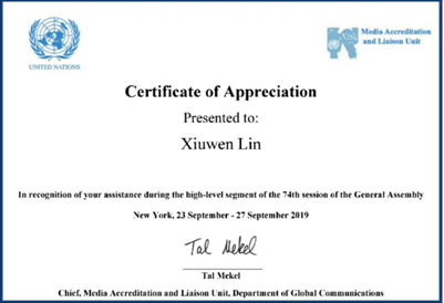 (第74届联合国大会“优秀志愿者证书”)