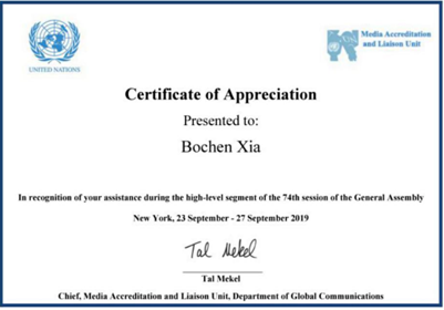 实习期间正值第74届联合国大会的召开,我校三名实习生有幸承担了联合国秘书长工作报告中文译本的编校工作,并通过了联合国全球传播部的选拔成为本届大会的志愿者,荣获“优秀志愿者证书”。法学院博士生夏伯琛感言:“终于有机会可以为祖国做一点力所能及的事,我们会主动引导前来参会的中国代表和媒体到达指定会场。最激动人心的是现场聆听国务委员王毅和联合国秘书长古特雷斯在新中国成立七十周年成果图片展开幕式上的致辞,向世界各国友人分享中国发展进步的辉煌成就。作为一名中国志愿者,强烈的民族自豪感油然而生!”