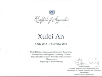 (联合国纽约总部“优秀实习生证书”)