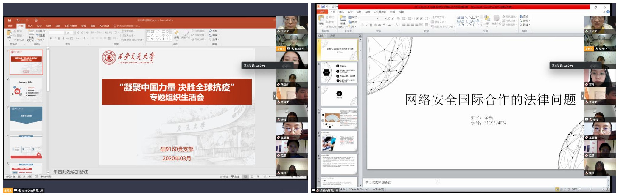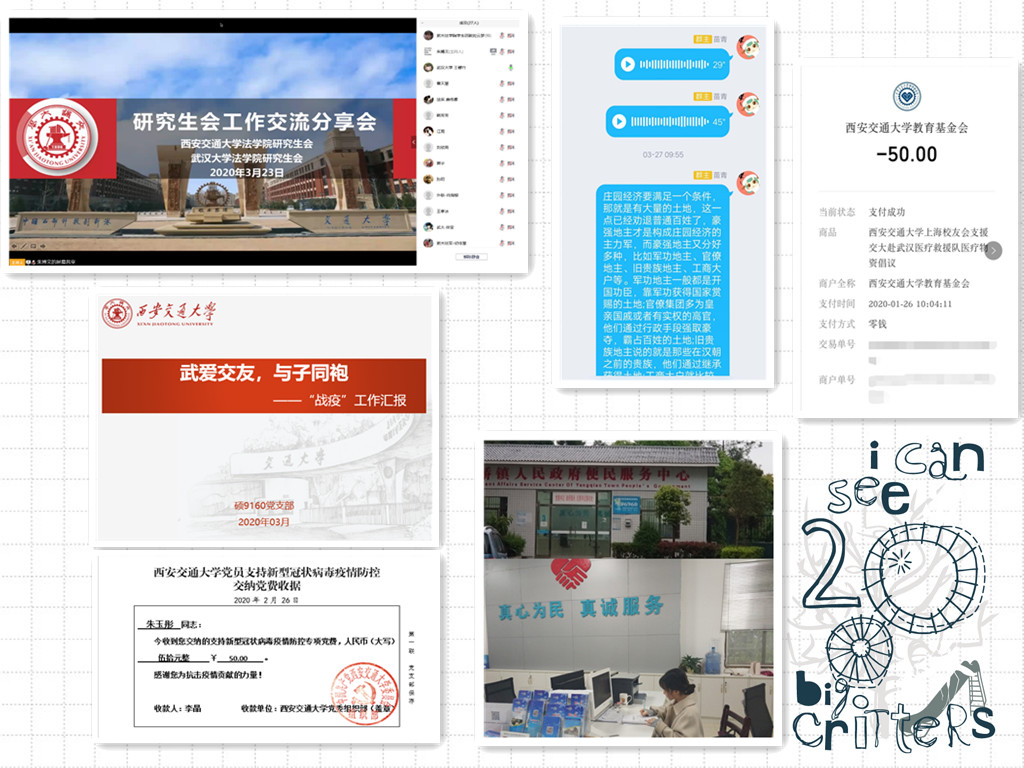 3月23日晚,西安交大法学院与武汉大学法学院联合举办“武爱交友,与子同袍”分享交流会,朱博文、孙阳分别就研会建设、支部工作与武大同学分享心得、畅谈经验,两校法科学子对近期“抗疫”工作展开热烈讨论。“武大法学院研会组织健全完善,活动丰富多彩,各位同学的分享干货满满,令人受益匪浅”,支部党员、法学院研会主席朱博文表示,“我们将组织专题研究,吸收借鉴有益经验,更好地为交大同学们服务”。“武大医学部白衣执甲、坚守阵地,交大医学部逆行出征、千里驰援,共同凝聚起抗击疫情的钢铁长城”,孙阳在总结发言中表示,“待疫情散去、山河无恙之时,希望大家可以实地交流,轻抚兴庆湖畔的秦砖汉瓦,品味珞珈山上的荆风楚韵。”