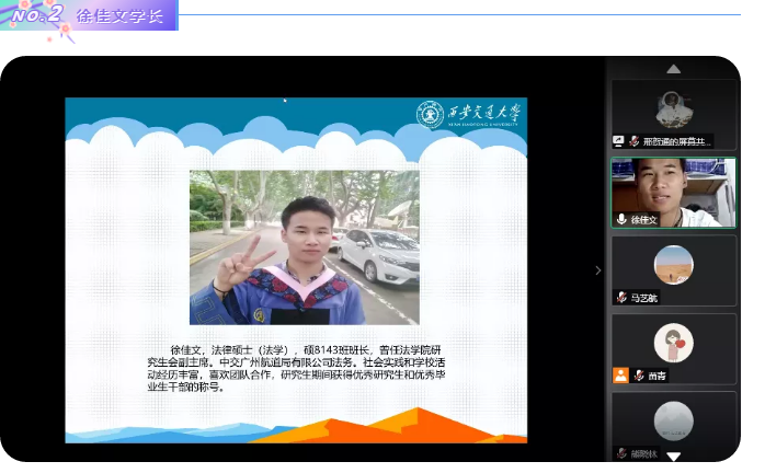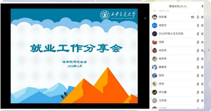 2020年6月20日晚,法学院举办了就业工作分享会,邀请了法学院晋瑞、徐佳文和熊晓林三位成功签约心仪就业单位的毕业生在线分享就业经验,为与会的40余名研究生悉心提供就业、实习建议,耐心答疑解惑。在抗击疫情常态化背景下,这些就业经验分享能够帮助学生提早知悉就业流程,统筹就业时间安排,把握就业过程加分项,顺应经济发展态势,规划未来职业方向。本次分享会由法学院研究生会邢贺通主持。