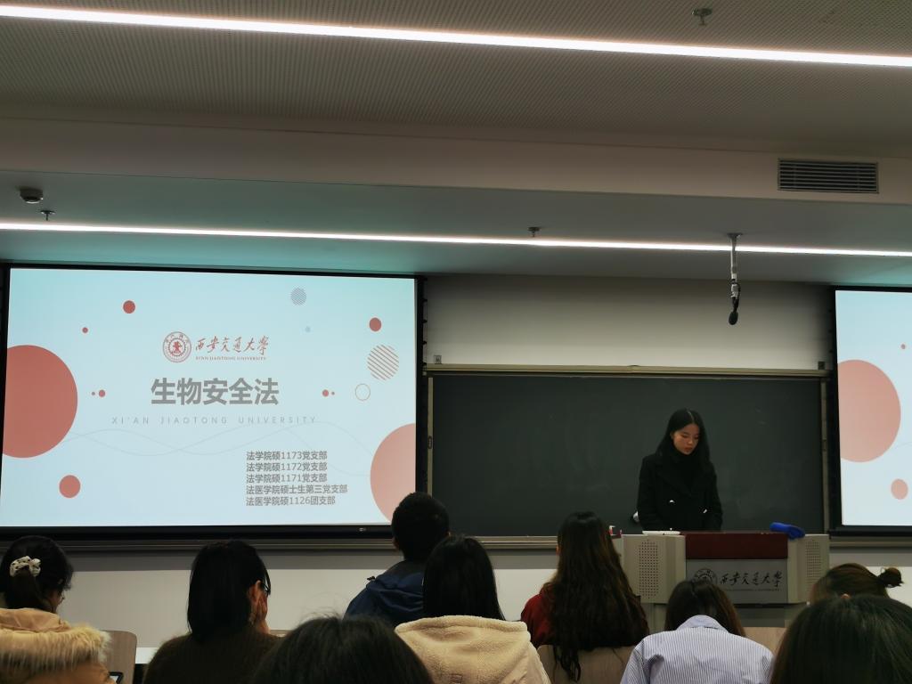 法学院硕1173班党支部组织委员罗梓瑜做了《中华人民共和国生物安全法》(以下简称生物安全法)的详细解读。她详细介绍了生物安全法的立法目的、原则和适用范围,并且着重介绍了生物安全法的立法亮点:明确了生物安全风险防控的基本原则和制度、建立健全了生物安全风险防控的领导体制。她认为2021年4月15日,中华人民共和国生物安全法正式施行,恰逢第六个全民国家安全教育日,赋予了这部法律施行以特殊的意义。生物安全关乎人民生命健康,关乎国家长治久安,关乎中华民族永续发展,是国家总体安全的重要组成部分,也是影响乃至重塑世界格局的重要力量。