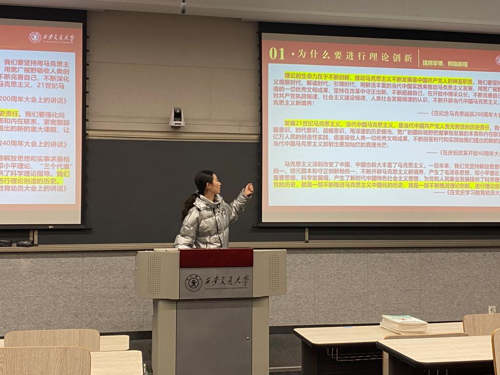 西安交通大学学生微宣讲团成员、硕1173班班长张云月作主题为“坚持理论创新,展现马克思主义开放性和时代性”的宣讲。张云月就为什么要进行理论创新这一问题,带领大家学习了习近平总书记关于理论创新的讲话,结合马克思主义的发展史和世界各马克思主义政党实践史对这一问题作出进一步解答,并深入浅出地讲解了马克思主义中国化的三次飞跃。