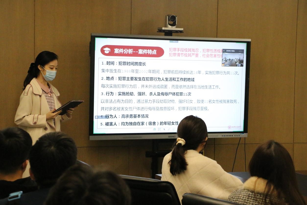 本期普法微课堂聚焦旷世大案“甘肃白银连环杀人案”。法学院马卓同学首先介绍了案件基本案情。从1988年至2002年间,高承勇在我国甘肃省白银市及内蒙古包头市连续杀害女性11名,作案跨度14年,最小受害人年仅8岁,手段残忍,极具隐蔽性,造成了巨大的社会恐慌。随后,马卓同学就罪犯的家庭背景、生活环境和作案习惯等方面进行了讲解,深入浅出地使同学们在短时间内对该案件形成了系统性认识。